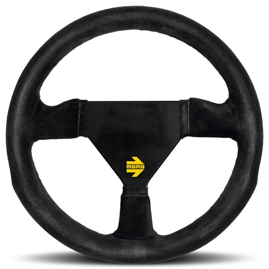 Najwyższej jakości kierownice włoskiego producenta MOMO stosowane od lat w samochodach wyścigowych i rajdowych. Zastosowanie bezszwowego wykończenia zamszowego na obręczy kierownicy zapewnia lepszy komfort użytkowania i większą trwałość. Ramiona kierownicy aluminiowe w kolorze czarnym z płaską częścią środkową i z żółtym logo MOMO.