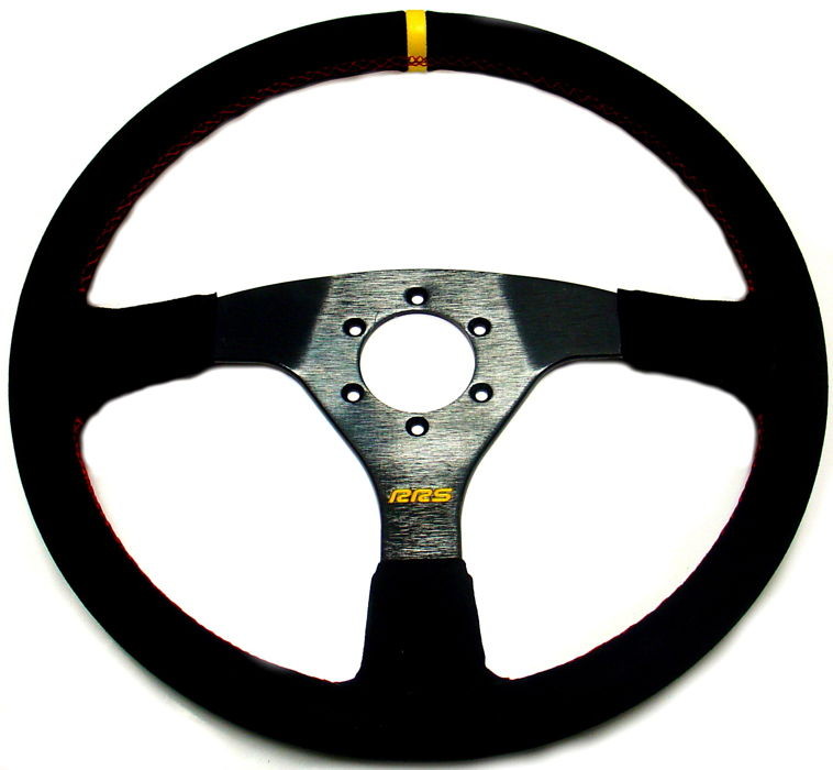 Płaska, trójramienna kierownica RRS Veloce o średnicy 350mm. Powleczona zamszem i wykończona czerwoną nicią. Ramiona kierownicy wykończono w kolorze czarnym. Kierownica posiada standardowy rozstaw śrub 6x70mm pasujący do większości popularnych nab.