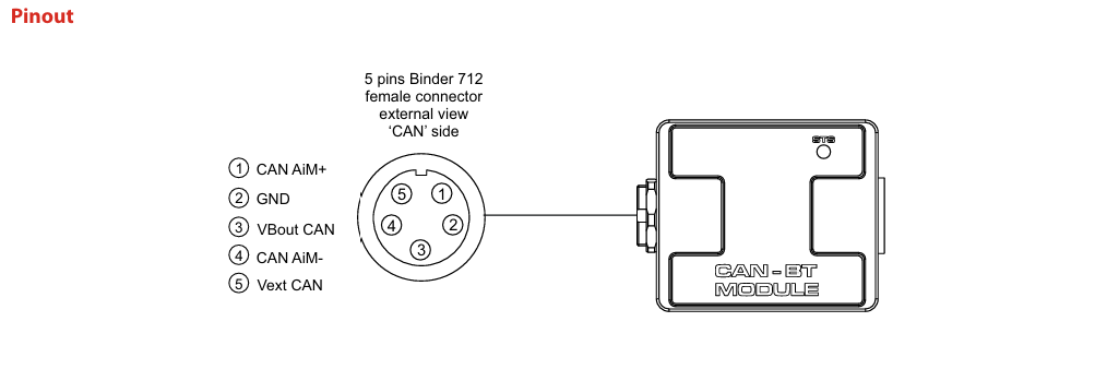 Pinout złącza Binder 712 1 – CAN AiM+, 2 – GND, 3 – VBout CAN, 4 – CAN AiM–, 5 – Vext CAN