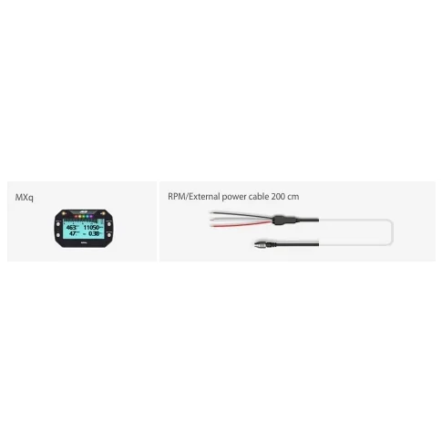 MXq występuje w kilku wersjach zestawów, różniących się przewodem komunikacyjnym/zasilającym (OBDII, CAN/RS232 lub RPM). Dzięki temu możesz dobrać kit do tego, czy łączysz się z ECU po OBDII/CAN/K-Line/RS232, czy chcesz logować RPM bez EC